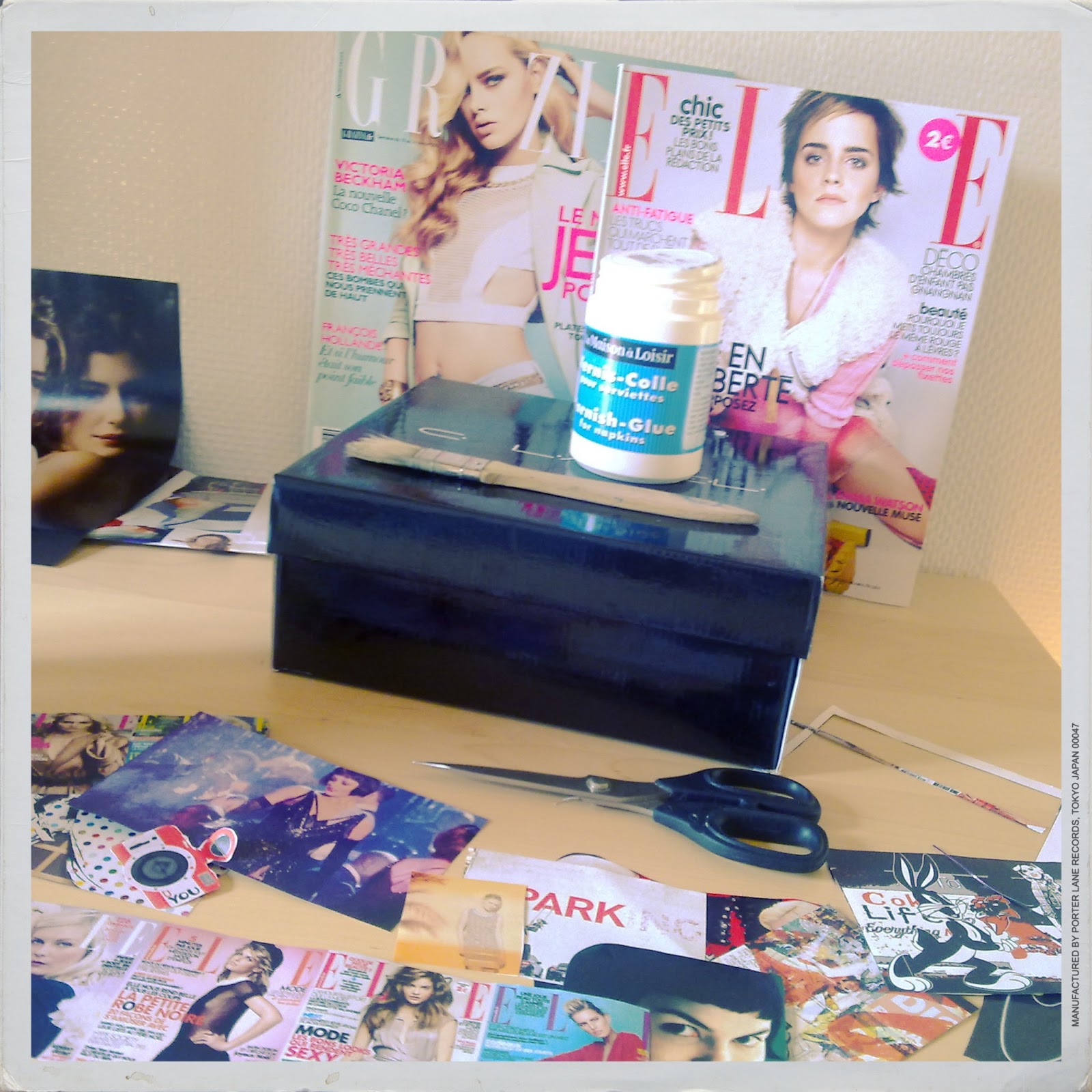 Il me fallait une boite pour ranger mes tissus, j'ai donc récupéré une boite à chaussures qui trainait par là. Mais j'avais envie de la personnaliser, et c'est là que j'ai pensé à mon vieil ami : le vernis-colle !